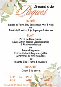 Le 5 Avril, notre Chef vous propose un menu unique à l’occasion du Dimanche de Pâques :